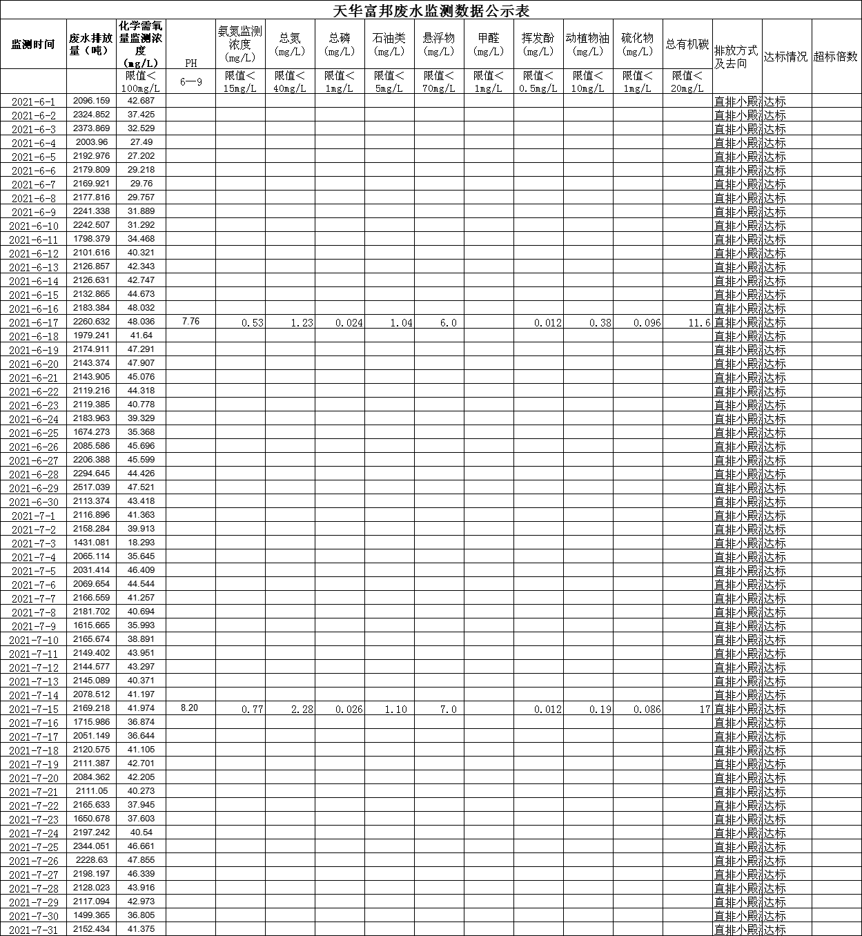 四川天華富邦化工有限責任公司6月、7月廢水監(jiān)測數(shù)據(jù)公示