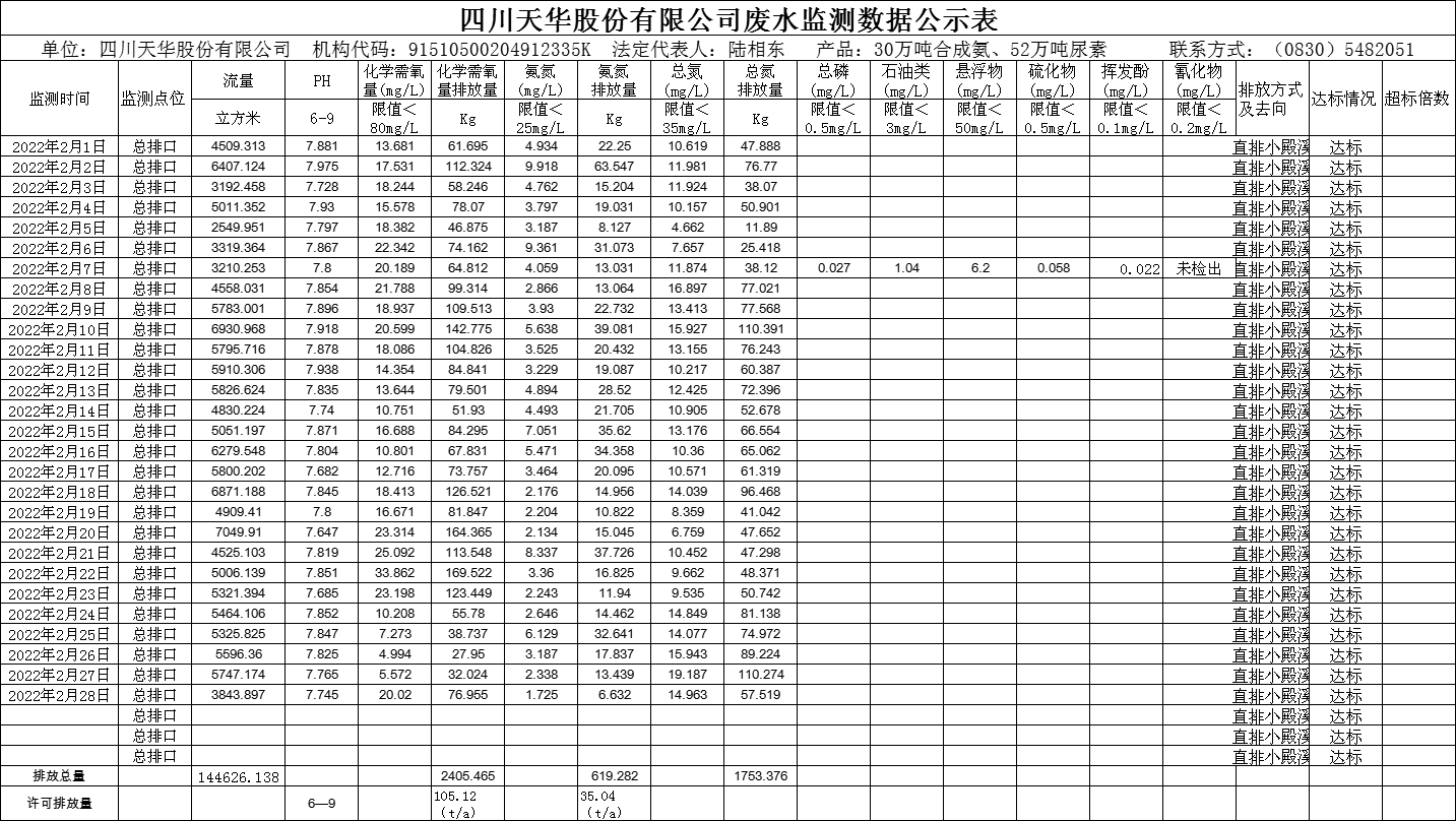 四川天華股份有限公司2022年2月廢水監測數據公示