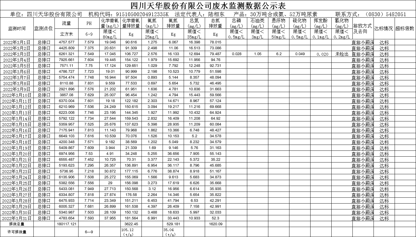 四川天華股份有限公司2022年3月廢水監(jiān)測數(shù)據(jù)公示