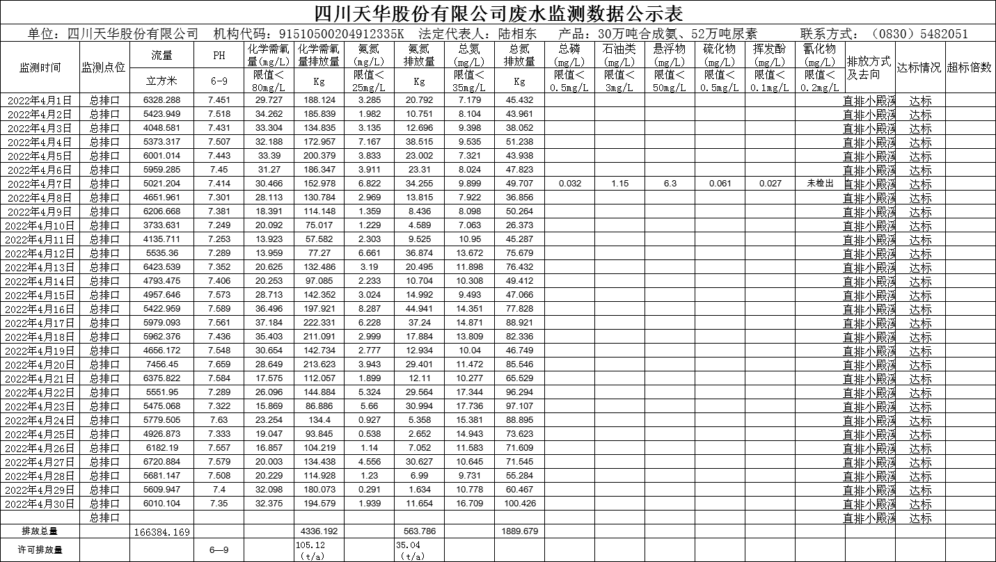 四川天華富邦化工有限責任公司2022年4月份廢水監測數據公示